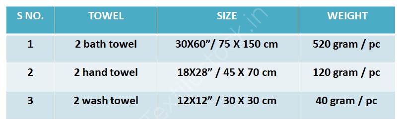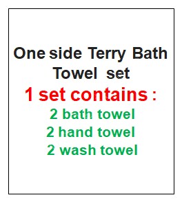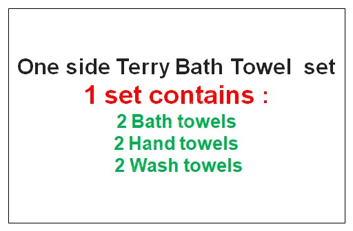 Exclusive Offer#2930 100% Cotton One side Terry Bath Towel set Stock Available at Heavy Discounts ⭐Customized packing available ⭐No defect Guaranteed. ⭐Fast and reliable shipping. ⭐Third Party Inspection Available ⭐One side Terry Bath Towel set 1 set contains (2 Bath towels , 2 Hand towels , 2 Wash towels) ⭐Bath Towel :-Size - 30X60”/ 75 X 150 cm :- Weight - 520 gram/pc ⭐Hand Towel :- Size - 18X28” / 45 X 70 cm :- Weight - 120 gram/pc ⭐Wash Towel :- Size - 12X12” / 30 X 30 cm :- Weight - 40 gram |
